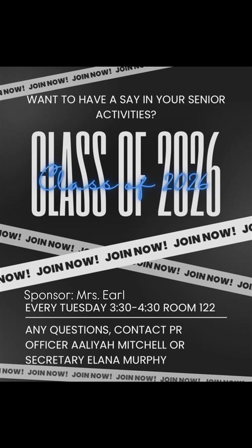 CLASS OF 2026!!!!Meetings are held to discuss planning events for 12th grade, as well as Graduation Pathways, the importance of scholarships, and College and Career Readiness. Class of 2026 meetings will take place in room 122 on Tuesdays. Class of 2026 Meetings are held to promote the following:Building a positive school cultureClass of 2026 meetings can help students feel a sense of community, empowerment, and responsibility. They can also help students learn healthy conflict management techniques and develop soft-personal skills.Improving student engagementClass of 2026 meetings can help students feel important and encourage them to participate in learning.Clarifying learning objectives and expectationsClearly stating expectations can help students understand what is expected of them and how to use their time productively.Supporting social and emotional learningClass of 2026 meetings can help students develop social and emotional skills that are important for life.Upcoming Events:Senior Sunset TBANational College Decision Day May 1stProm May 8thGrad Nite May 16thSenior Luncheon May 19th